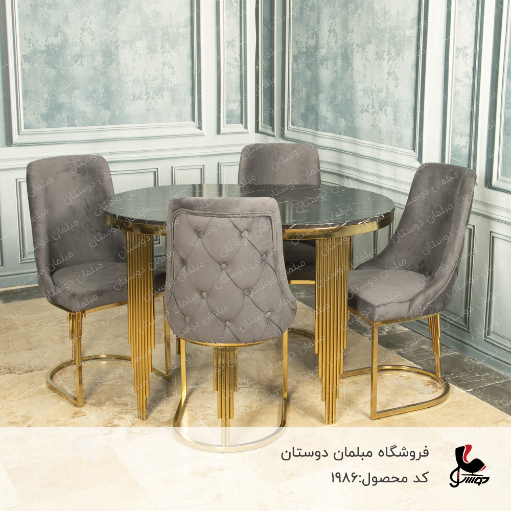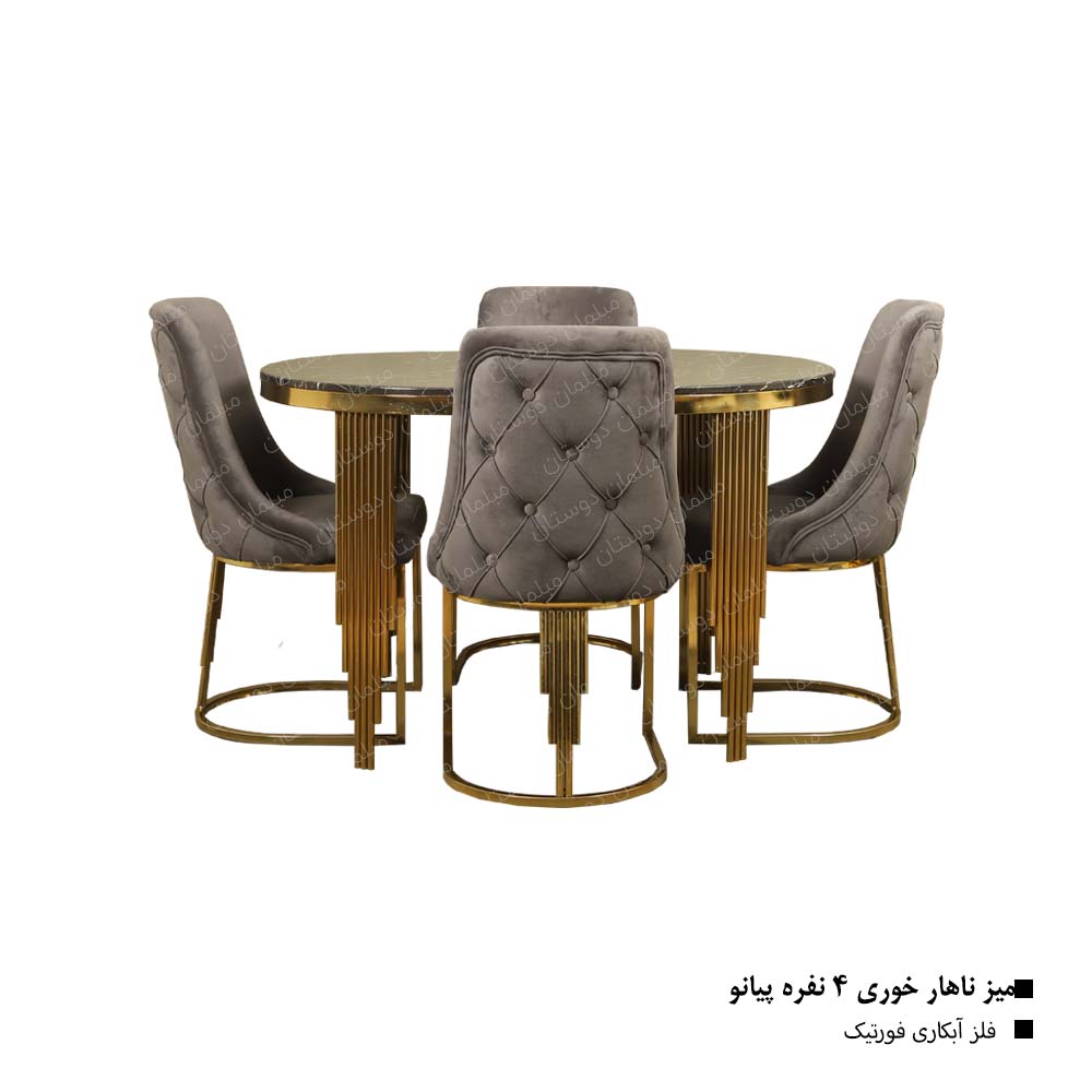ست نهارخوری مدل پیانو راحی پایه منحصر به فرد پایه‌های میز و صندلی‌ها دارای طراحی عمودی و متوالی هستند که به نظر می‌رسد از چندین خط موازی طلایی تشکیل شده‌اند، شبیه به کلیدهای پیانو. این طراحی به آن ظاهری مدرن و لوکس می‌بخشد. در خانه‌ های امروزی یکی از اجزای اصلی خانه به شمار می رود که با توجه به متراژ منزل، چیدمان و دکوراسیون از مدل‌ های اسپرت، کلاسیک و… همچنین ظرفیت‌ های مختلف و سایر مدل‌ ها استفاده می‌ شود. البته با توجه به متراژ امروزی خانه‌ ها، اکثر خانواده‌ ها به دنبال میز ناهارخوری های کم جا، و کوچک هستند تا بتوانند علاوه بر رفع نیاز، زیبایی دکوراسیون منزل خود را نیز حفظ کنند. البته خرید میز ناهارخوری با وجود تنوع بالا به راحتی امکان پذیر است و شما می توانید با توجه به ایده آل های خود، بهترین خرید را انجام دهید. مبلمان دوستان به واسطه تنوع بالایی که برای خرید میز ناهارخوری دارد، توانسته است به عنوان بهترین مجموعه شناخته شود.